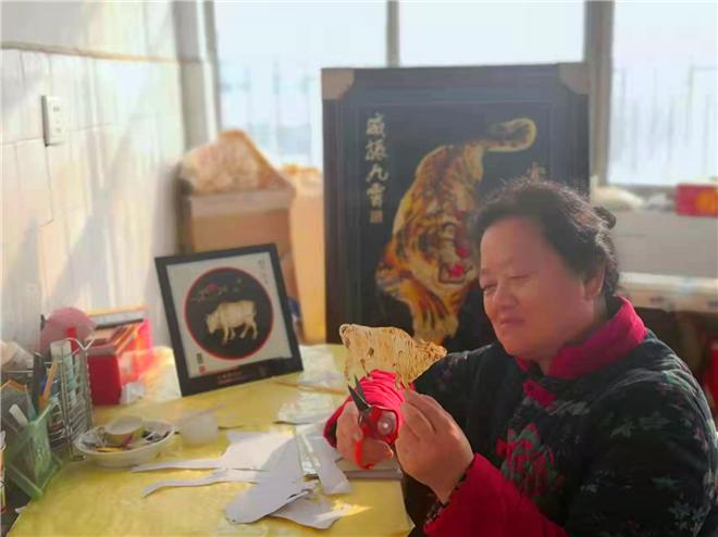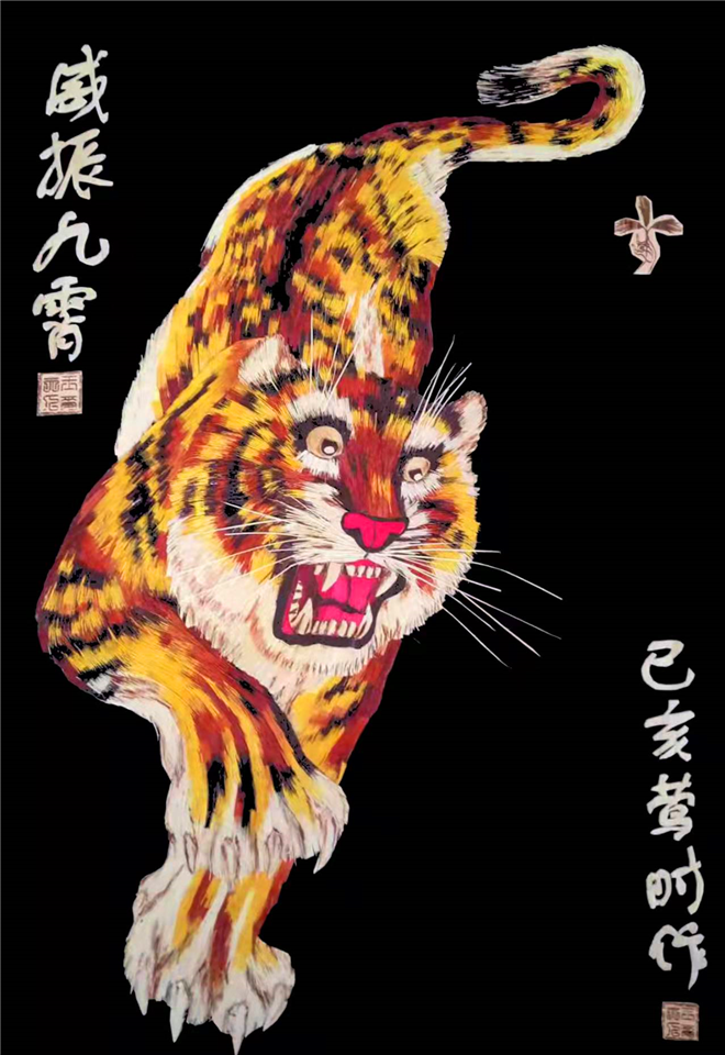 “虎在中國是極其有力量的動物?!?月25日,秸稈畫技藝代表性傳承人、中國民間文藝家協(xié)會國家級會員王春梅告訴記者,她耗時近半年創(chuàng)作的秸稈畫《威震九霄》已完成。記者看到,作品中的老虎長半米有余,威風(fēng)凜凜、活靈活現(xiàn),用平面的方式展現(xiàn)了立體的效果。“2022年是虎年。在古代,老虎就以威風(fēng)凜凜的形象被視為勇氣的象征,來表現(xiàn)軍人的勇敢和堅強。古時候關(guān)于將士大臣的美譽就有虎將、虎臣、虎士等。”王春梅說。
