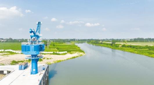 盛夏七月,在項城市東部的項城港,幾架“高聳入云”的新式固定式起重機的主體已安裝完畢,剩余的部件堆放在地上,巨大的框架和鮮紅的涂裝展示著它們的力量。一側,千噸級貨輪正??吭陂L長的泊位前,起重機緩緩卸下貨艙內的散貨。