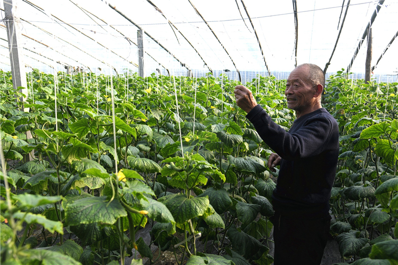 扶溝縣柴崗鄉(xiāng)梅橋村是遠(yuǎn)近聞名的黃瓜種植專業(yè)村,全村1200畝土地上建有1100畝蔬菜大棚,最多的一戶村民有大棚10多個(gè),畝均效益5萬多元,黃瓜種植成為當(dāng)?shù)剜l(xiāng)村振興的好產(chǎn)業(yè)。圖為昨日70多歲的脫貧戶梅鐵棍在幫助兒子管理黃瓜。