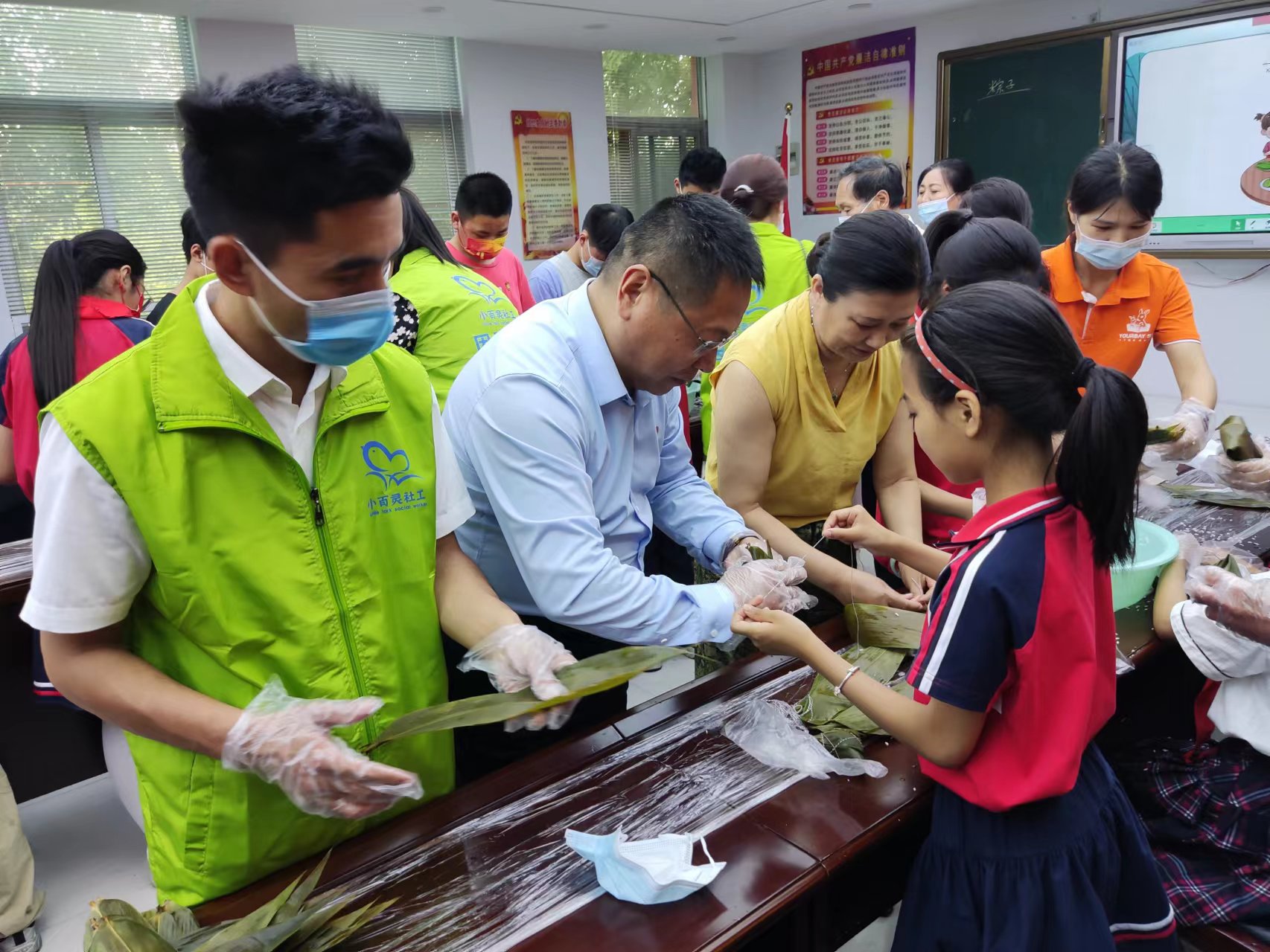 活動中,文昌小學(xué)教師通過PPT、游戲等形式,向孩子講解端午節(jié)的來歷、習(xí)俗及有關(guān)端午節(jié)的故事,引導(dǎo)孩子弘揚中國傳統(tǒng)文化。文昌小學(xué)社工站志愿者給孩子表演了影子劇《最愛的,是我》。周口師范學(xué)院工作人員向同學(xué)們講解了包粽子的方法。在社工的指導(dǎo)下,一雙雙忙碌的小手穿梭在一張張翠綠的粽葉間。社工們還為每位孩子準備了粽子禮包,讓他們帶回家給爺爺奶奶嘗一嘗。