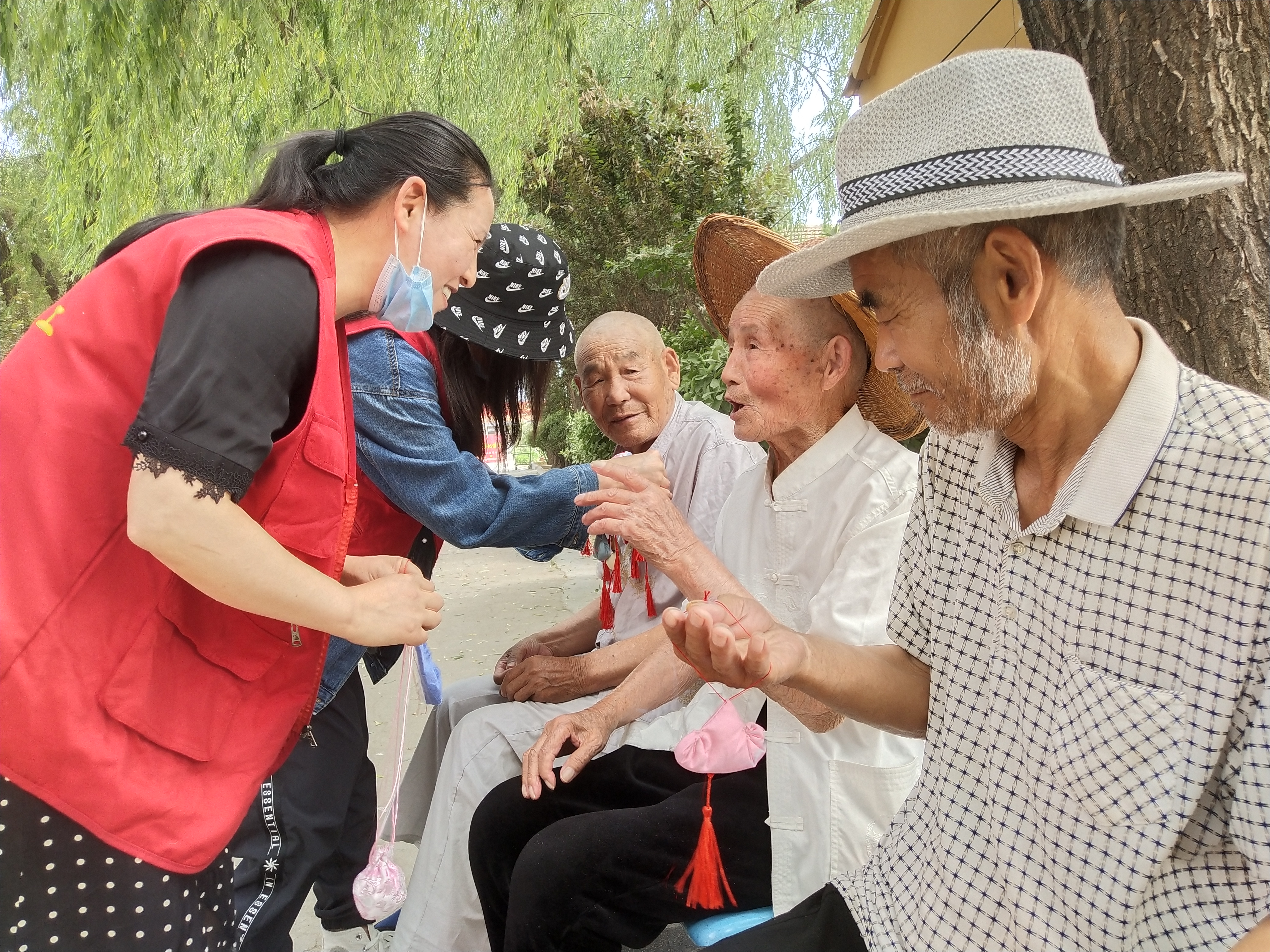 “來(lái),來(lái),來(lái),這是玉英從江蘇省南通市給咱郵寄過(guò)來(lái)的香包,今天過(guò)節(jié)哩,大家每人帶上一個(gè),祝愿大家胸前飄香,端午安康!”