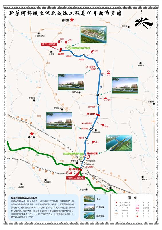 記者了解到,規(guī)劃中的鄲城港區(qū)是以新蔡河為依托,通過分析論證,確定其位置在新蔡河航運工程航道起點鄲城縣錢店鎮(zhèn),航道終點為沈丘縣新安集沙潁河口,航道里程31公里。航道通航標(biāo)準(zhǔn)為限制性Ⅳ級,設(shè)計船舶為500噸級。航道底寬40米,最小設(shè)計水深3.1米,最小彎曲半徑320米。船閘按照Ⅳ級船閘標(biāo)準(zhǔn)建設(shè)。沿線建設(shè)沈丘港區(qū)新安集、鄲城港區(qū)錢店兩個作業(yè)區(qū),設(shè)計500噸級泊位8個,改建礙航橋梁標(biāo)準(zhǔn)9座。初步估算,工程總投資19.4億元。