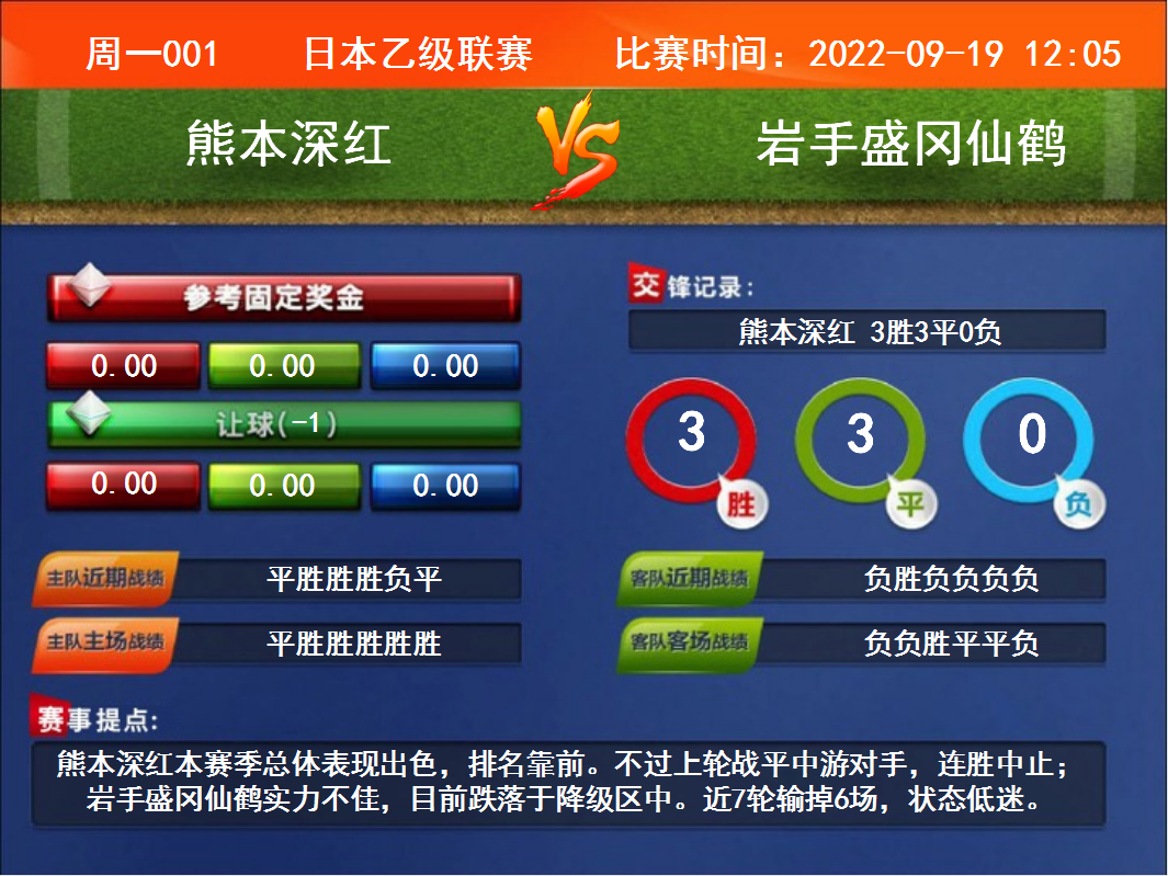 周一001  日本乙級(jí)聯(lián)賽 熊本深紅VS巖手盛岡仙鶴