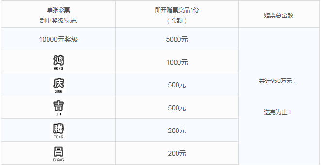 活動期間,購彩者在我省任一體彩銷售實體店購買指定活動票種,若單張彩票刮中符合獎勵條件的獎級或標(biāo)志,經(jīng)實體店終端兌獎設(shè)備成功完成獎金兌付(如中獎)及促銷兌獎掃描后,即可獲得即開票贈票獎品一份。總額有限,送完為止,詳見下表: