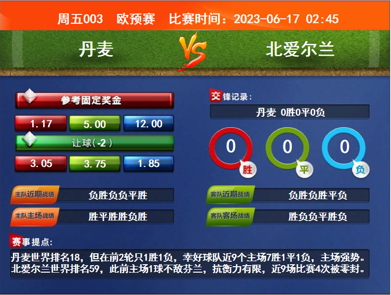 比賽時間:2023-06-17 02:45賽事提點:丹麥?zhǔn)澜缗琶?8,但在前2輪只1勝1負(fù),幸好球隊近9個主場7勝1平1負(fù),主場強勢。北愛爾蘭世界排名59,此前主場1球不敵芬蘭,抗衡力有限,近9場比賽4次被零封。