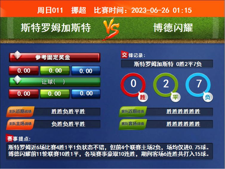 比賽時(shí)間:2023-06-26 01:15賽事提點(diǎn):斯特羅姆近6場(chǎng)比賽4勝1平1負(fù)狀態(tài)不錯(cuò),但前4個(gè)聯(lián)賽主場(chǎng)2負(fù),場(chǎng)均僅進(jìn)0.75球。博德閃耀前11輪聯(lián)賽10勝1平,各項(xiàng)賽事豪取10連勝,期間客場(chǎng)6連勝共打入15球。