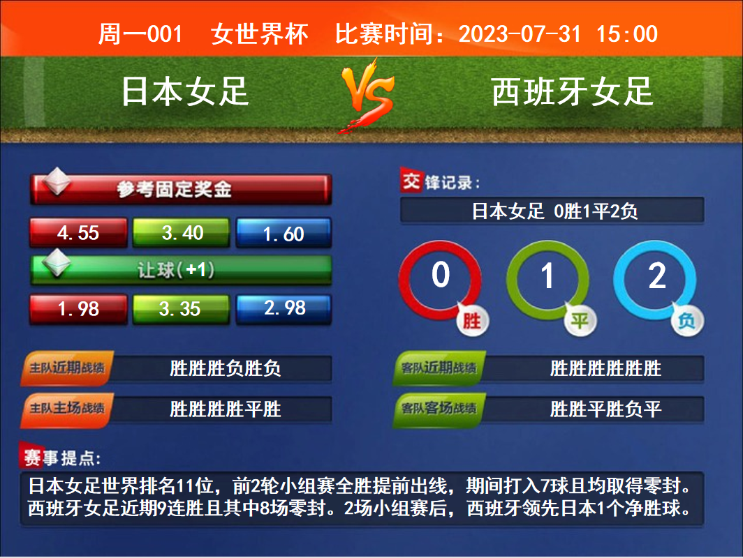 比賽時(shí)間:2023-07-31 15:00賽事提點(diǎn):日本女足世界排名11位,前2輪小組賽全勝提前出線,期間打入7球且均取得零封。西班牙女足近期9連勝且其中8場零封。2場小組賽后,西班牙領(lǐng)先日本1個(gè)凈勝球。