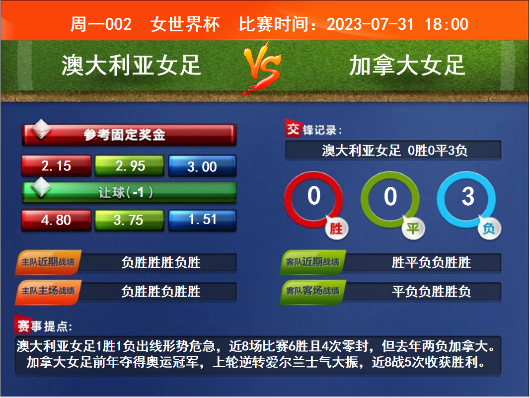 比賽時(shí)間:2023-07-31 18:00賽事提點(diǎn):澳大利亞女足1勝1負(fù)出線形勢危急,近8場比賽6勝且4次零封,但去年兩負(fù)加拿大。加拿大女足前年奪得奧運(yùn)冠軍,上輪逆轉(zhuǎn)愛爾蘭士氣大振,近8戰(zhàn)5次收獲勝利。