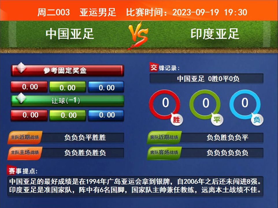 比賽時間:2023-09-19 19:30賽事提點:中國亞足的最好成績是在1994年廣島亞運會拿到銀牌,自2006年之后還未闖進8強。印度亞足是準國家隊,陣中有6名國腳,國家隊主帥兼任教練,遠離本土戰(zhàn)績不佳。
