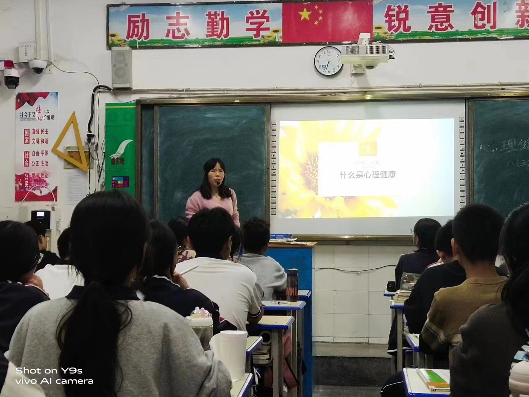 學校政教處提前制作好課件,各班班主任充分利用第一節(jié)晚自習,從“什么是心理健康”“中小學生心理健康的標準”“增進心理健康的途徑”三個方面進行認真講解,引導學生合理調節(jié)自己的心理,啟示學生日常生活中不僅需要有健康的體魄,而且更需要有健康的心靈,并正確認識自我、接納自我,享受美好人生。特別在講到“增進心理健康途徑”這一環(huán)節(jié)時,學生積極發(fā)言,師生頻繁互動,最終讓學生們明白對于同一件事情,個人想法不同帶來的情緒也不相同,要保持樂觀的生活態(tài)度,即使遭遇到挫折、失敗,依然能夠保持積極向上的情緒。