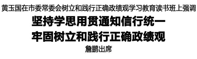 黃玉國指出,黨的十八大以來,習(xí)近平總書記圍繞樹立和踐行正確政績觀發(fā)表的一系列重要論述,立意高遠、內(nèi)涵豐富、思想深刻,為開展樹立和踐行正確政績觀學(xué)習(xí)教育指明了方向、提供了重要遵循。全市廣大黨員干部要帶著信仰學(xué)、帶著責(zé)任悟,深刻把握“政績?yōu)檎l而樹”,堅守為民造福的根本立場;深刻把握“樹什么樣的政績”,創(chuàng)造經(jīng)得起檢驗的過硬實績;深刻把握“靠什么樹政績”,錘煉真抓實干的務(wù)實作風(fēng),做到學(xué)思用貫通、知信行統(tǒng)一。