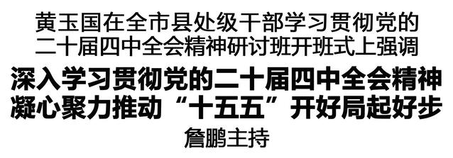 本報訊(記者 王艷 劉昂) 3月23日,全市縣處級干部學習貫徹黨的二十屆四中全會精神研討班開班式在市委黨校舉行。市委書記黃玉國出席并作動員講話,強調要聚焦黨的二十屆四中全會精神和習近平總書記在省部級主要領導干部專題研討班上的重要講話精神,集中研學、深入研討,凝心聚力推動“十五五”開好局起好步,奮力譜寫中原大地推進中國式現(xiàn)代化周口新篇章。市長詹鵬主持。