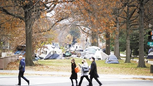 12月8日,在美國華盛頓,行人經(jīng)過無家可歸者居住的帳篷?!?a href="http://m.shjcele.com/content/2021-12/11/content_962080.html" target="_blank" >[詳細]
