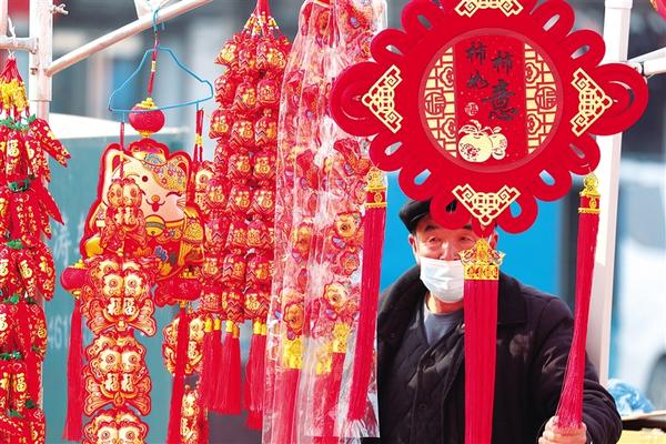 2月5日,商水縣固墻鎮(zhèn)街頭,紅紅火火的年貨攤位一字排開,大紅的春聯(lián)、福字等商品琳瑯滿目。圖為群眾在挑選心儀的年貨。