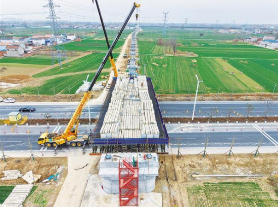 3月18日,在跨寧洛高速特大橋連續(xù)梁施工現場,30余名工人正在進行連續(xù)梁的鋼筋焊接和混凝土澆筑施工。