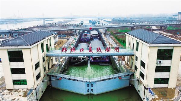 鄭埠口樞紐工程是沙潁河周口段關(guān)鍵性航運樞紐工程。近年來,通過航道疏浚、船閘擴建等升級改造工程,鄭埠口樞紐通航能力顯著提升,為周口從“黃土經(jīng)濟”向“藍海經(jīng)濟”轉(zhuǎn)型提供了有力支撐。圖為從周口港出發(fā)的貨船等待通過鄭埠口復(fù)線船閘。