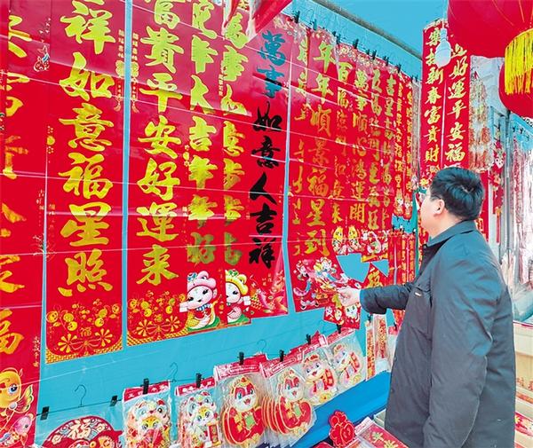 1月11日,市民在挑選對(duì)聯(lián)。當(dāng)日,記者在中心城區(qū)走訪時(shí)看到,琳瑯滿目的春節(jié)飾品已火熱上市,不少商家把一個(gè)個(gè)大紅燈籠高高掛起,市民采購年畫、福字、對(duì)聯(lián)、窗花、中國結(jié)等春節(jié)飾品,“囤貨”迎春節(jié)。