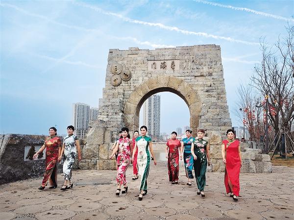 1月14日,身著各色旗袍的模特冒著嚴(yán)寒在南寨歷史文化街區(qū)普濟(jì)門前進(jìn)行模特走秀表演,為冬日的城區(qū)增添了一抹亮麗色彩。