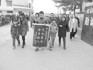 本報(bào)訊 (記者 朱紅 文/圖)3月7日本報(bào)以《姜振英:冰河救起雙胞胎》為題報(bào)道了沈丘縣縣直高中教師姜振英冰河勇救落水雙胞胎的英勇事跡。昨日上午,沈丘縣縣直高中鑼鼓喧天、格外熱鬧。在鑼鼓聲中,得救孩子和親屬一起將一面寫有“見義勇為 舍身救人”的錦旗送到姜振英手中。