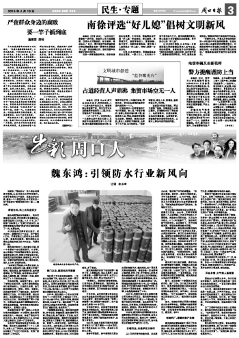 眼下,他正在做一個新型施工體系的示范、推廣工作。這個施工體系簡而言之,就是用新型的非固化膠體粘合防水材料,直接鋪在施工面上,一改過去用噴槍粘合的方式,省工省時,防水效果更佳?!斑@個體系做好了,將徹底改變以往的防水工藝。”魏東鴻對此極有信心。
