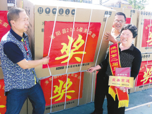 左圖 5月19日,淮陽(yáng)縣隆重表彰63戶2015年度“最美家庭”。近年來(lái),該縣依托“婦女之家”,通過召開座談會(huì)、講親情故事、曬照片等形式,大力開展尋找“最美家庭”活動(dòng),取得了良好的社會(huì)效果。圖為當(dāng)選“最美家庭”的齊國(guó)蘭高興地領(lǐng)取獎(jiǎng)品。
