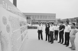 縣領(lǐng)導(dǎo)在雷爍光電廠區(qū)參觀首屆職工技能運動會展板。