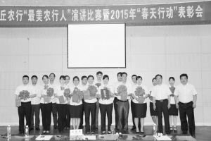 6月6日,沈丘農(nóng)行召開“最美農(nóng)行人”演講比賽暨2015年“春天行動(dòng)”表彰大會(huì)。圖為獲獎(jiǎng)人員合影留念。(陳高翔 攝)