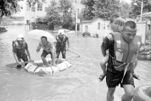 7月14日,四川省瀘州市的消防官兵在龍馬潭區(qū)救援受災群眾。當日,四川省瀘州市遭暴雨襲擊,部分路段內(nèi)澇嚴重,交通中斷。據(jù)瀘州市氣象局統(tǒng)計,截至12時,該市最大降雨量超過200毫米。 新華社發(fā)